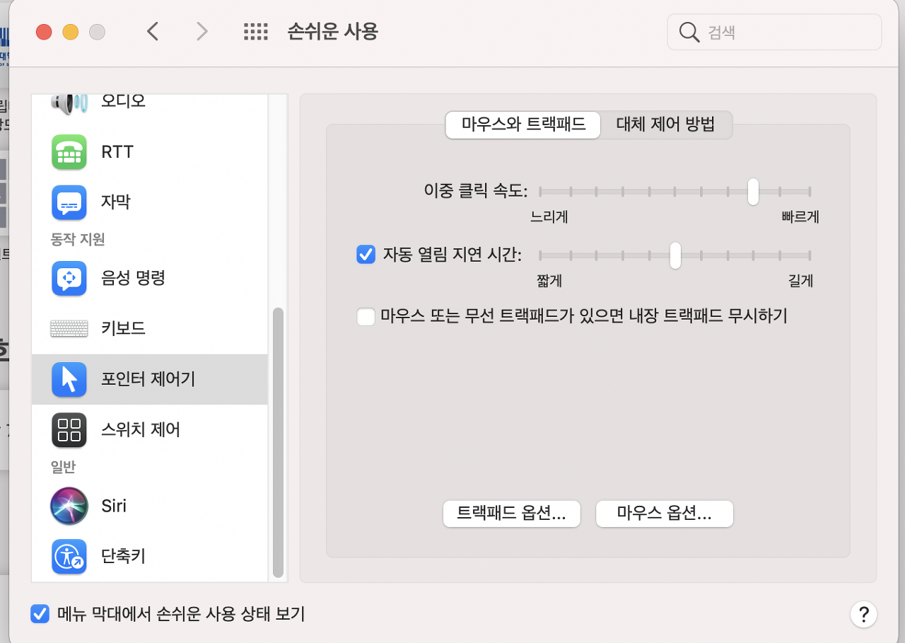 손쉬운 사용의 좌측 메뉴를 쭉 내리면 포인터 제어기가 나타납니다. 포인터 제어기를 선택하면 "마우스 또는 무선 트랙패드가 있으면 내장 트랙패드 무시하기"를 선택합니다.