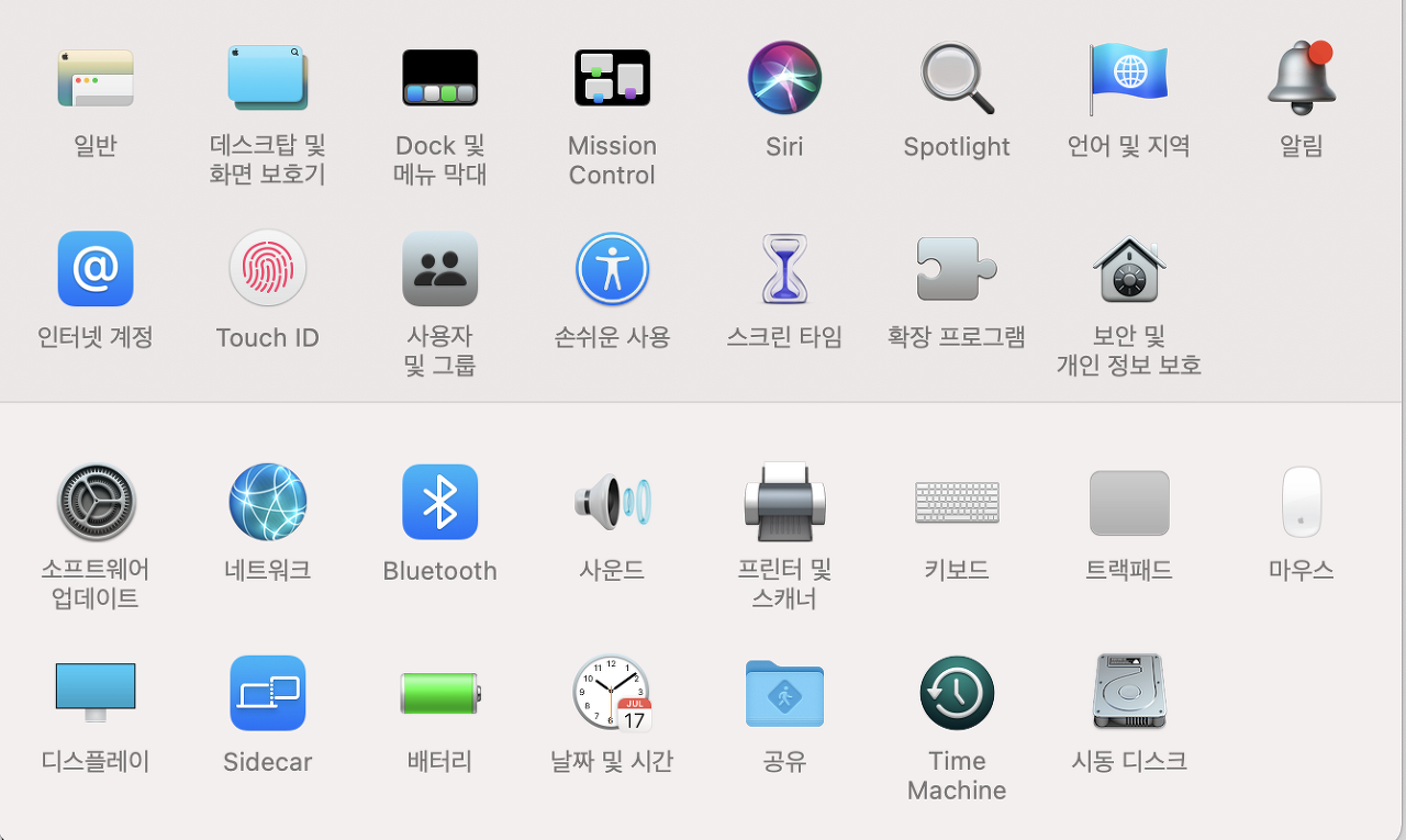 시스템 환경 설정은 아래처럼 생긴 아이콘을 누르거나 우측 상단 메뉴 바의 사과 모양 - 시스템 환경 설정을 클릭하여 들어갈 수 있습니다.