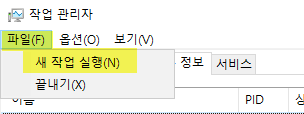 3. 작업관리자 상단 탭에서 파일 클릭 -> 새 작업 실행을 클릭 합니다.