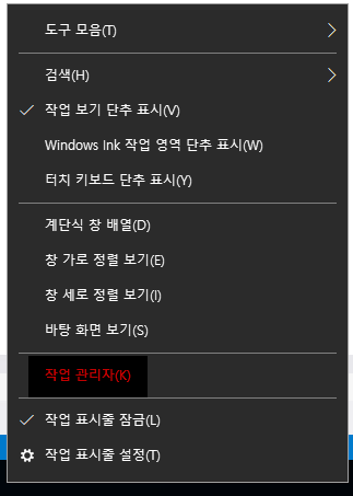 1. 윈도우 하단 작업표시줄에 마우스 우 클릭 후 작업관리자를 클릭합니다.