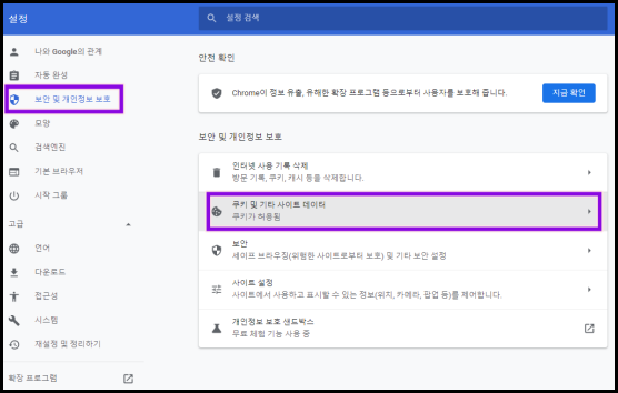 2. 쿠키 및 기타 사이트 데이터 메뉴 클릭
