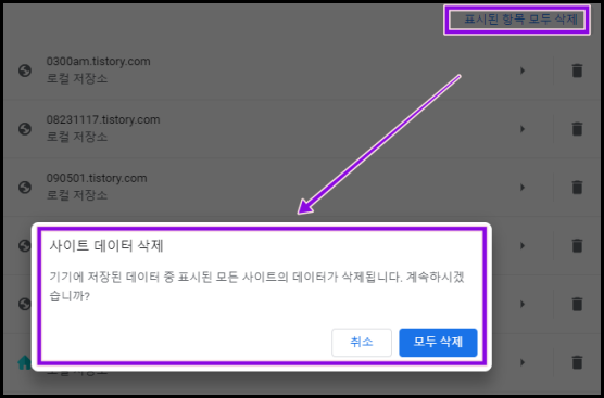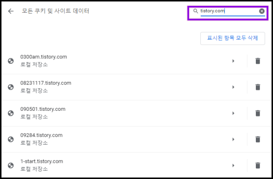 - 특정 사이트의 모든 쿠키를 삭제하려면 우측 상단 '표시된 항목 모두 삭제'
