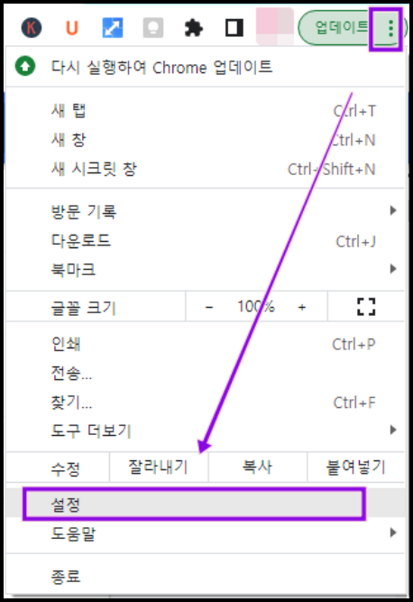1. 크롬 브라우저의 설정 메뉴로 이동