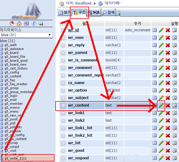 좌측 DB 테이블에서 원하는 게시판 선택 후 wr_content 필드 수정 버튼 클릭