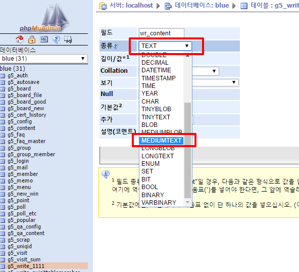 그누보드는 게시판 내용 값이 저장되는 wr_content 필드 타입이 TEXT로 되어 있습니다.