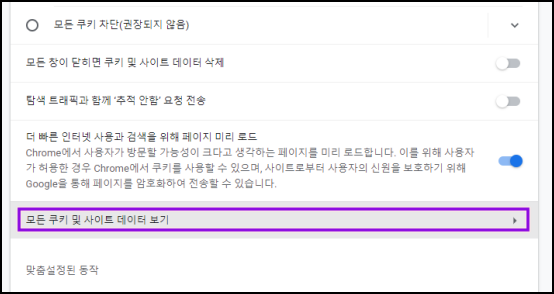 3. '모든 쿠키 및 사이트 데이터 보기' 메뉴 클릭